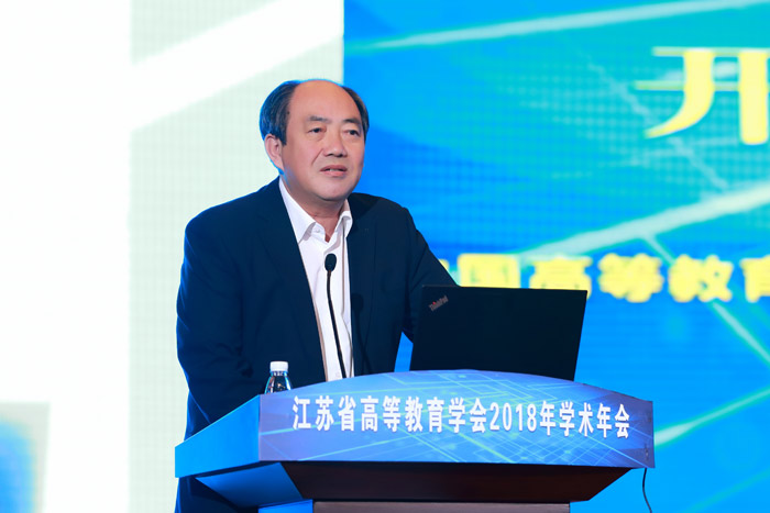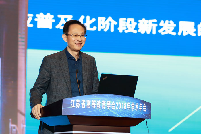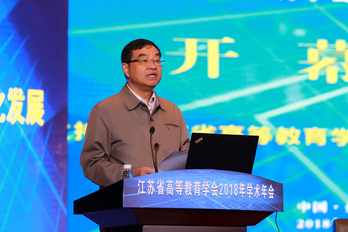 开幕式后,江苏省教育厅副厅长王成斌研究员和华东师范大学教育学部主任袁振国教授作主旨学术报告,江苏省高等教育学会副会长、江苏开放大学校长兼党委副书记崔新有教授主持。王成斌以《新时代江苏高等教育的挑战与变革》为题,结合当前教育工作会议精神和习近平总书记有关高等教育论述,把握了当前高等教育发展的国内外形势与任务。报告回顾与总结江苏高等教育40年发展道路,展望当前我省高等教育面临的新矛盾,提出了新阶段推进江苏高等教育迈向高质量发展的新举措。袁振国以《适应普及化阶段新发展的未来高等教育》为题,从宏观视角分析了高等教育发展的客观规律,指出了普及化阶段高等教育将面临的问题。两个报告高屋建瓴,为普及化阶段高等教育发展提供了思路。江苏省高等教育学会副会长、江苏开放大学校长兼党委副书记崔新有校长主持了学术报告。